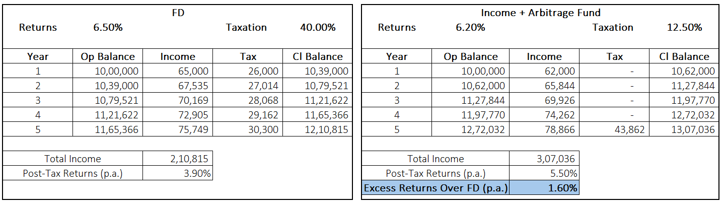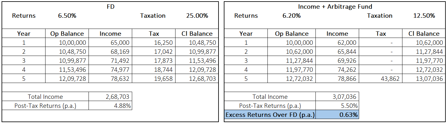 Fixed Deposits vs. Income + Arbitrage Fund – Post-tax Returns |